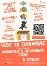 Vous pouvez vous inscrire dès à présent sur HelloAsso (https://www.helloasso.com/associations/apeep-de-tierce/even ements/apeep-de-tierce-vide-ta-chambre-3eme-edition-09-11-25 ?_gl=1%2azvghwp%2a_gcl_au%2aOTUzMTM4My4xNzU0OTg2Njc4LjE1MTgx MzQ4MzYuMTc1ODg4MjI0MC4xNzU4ODgyMjQw