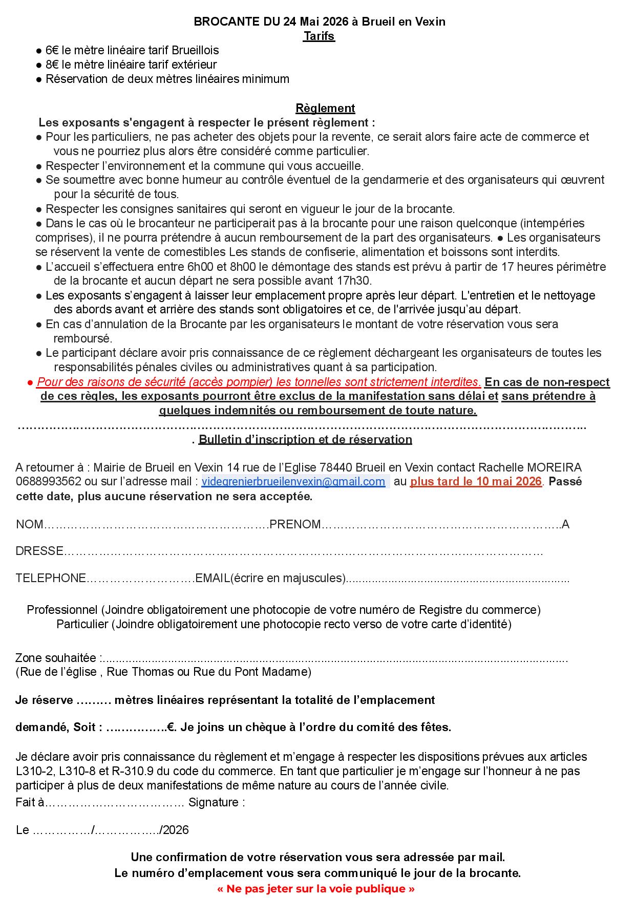 L’accueil s’effectuera entre 6h00 et 8h00 le démontage des stands est prévu à partir de 17 heures périmètre de la brocante et aucun départ ne sera possible avant 17h30.